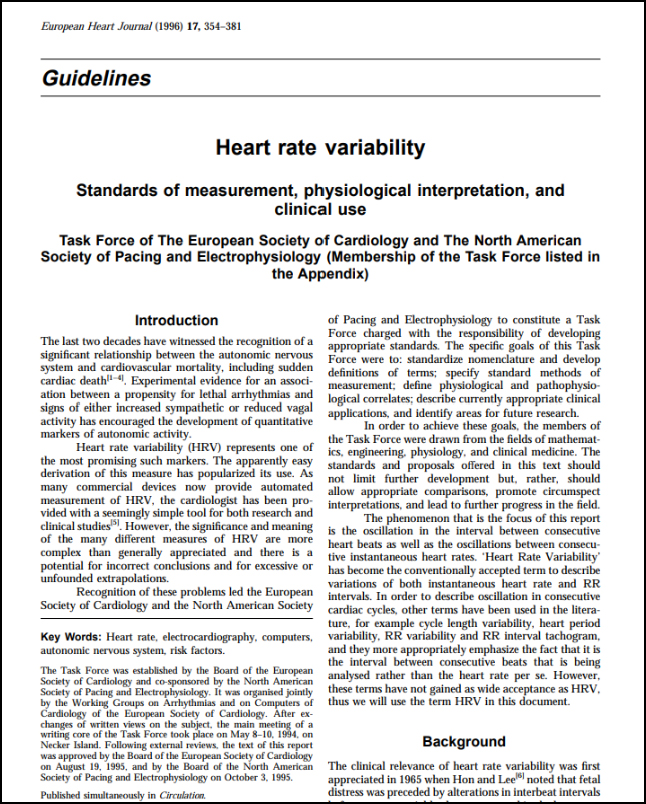 1996年,歐洲心臟學會(ESC)與北美起搏與電生理學會(NASPE)工作小組定義并確立了心率變異的測量標準、生理關聯性和臨床應用范圍